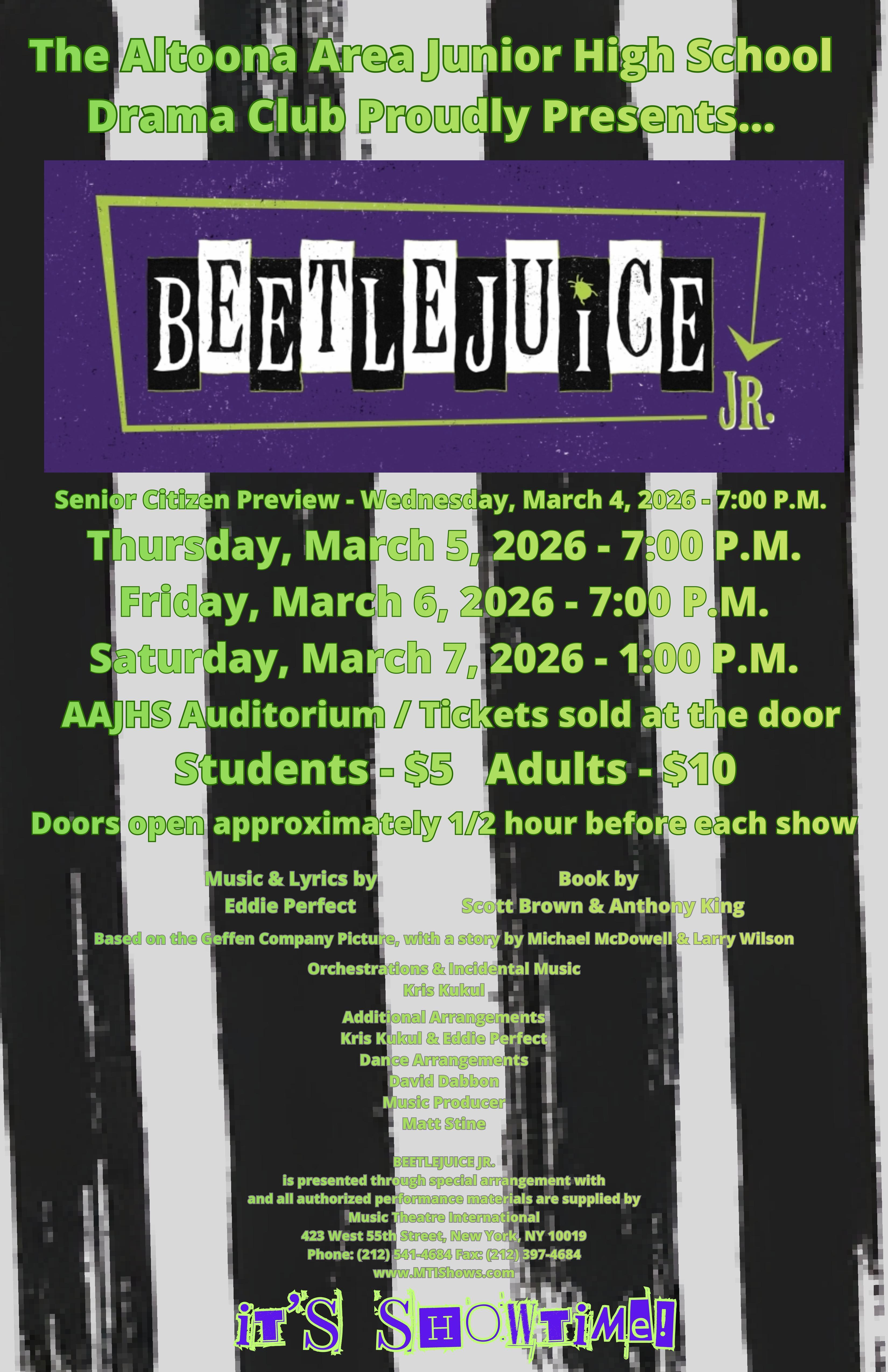 The Altoona Area Junior High School Drama Club is excited to present the wildly entertaining musical Beetlejuice Jr. this March in the AAJHS Auditorium. Performances will be held on Thursday, March 5th and Friday, March 6th at 7:00 p.m., with a Saturday matinee on March 7th at 1:00 p.m. A special Senior Citizen Preview will take place on Wednesday, March 4th at 7:00 p.m. All performances will be held in the AAJHS Auditorium.